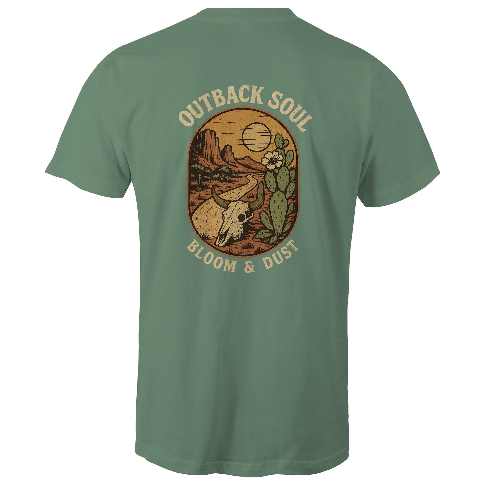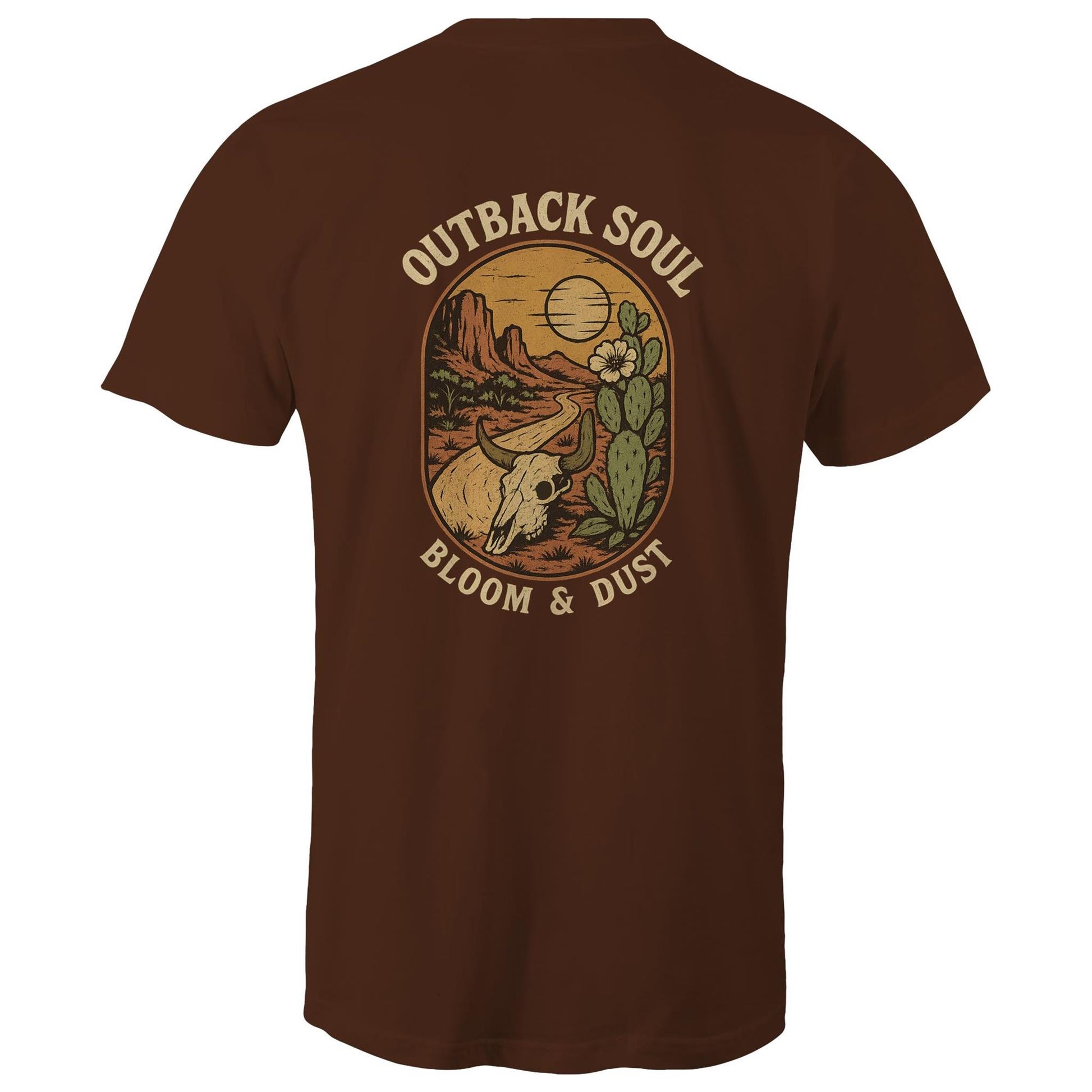 The Outback Soul Tee captures the raw beauty and rugged spirit of country Australia. Featuring a weathered cattle skull set along a dusty winding track, framed by desert blooms and cacti beneath the wide open sky, this design speaks to resilience, freedom, and the soul of the outback.
